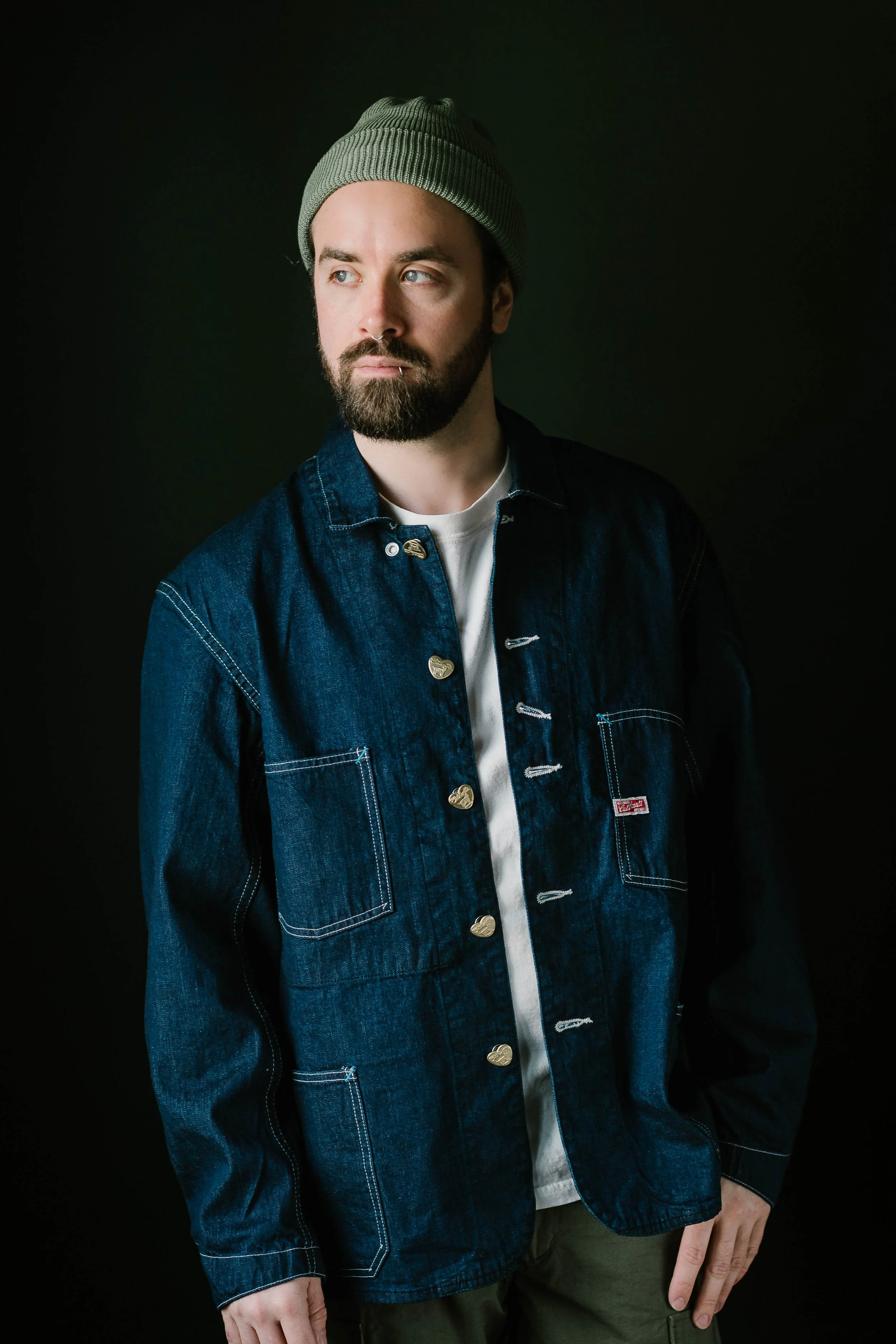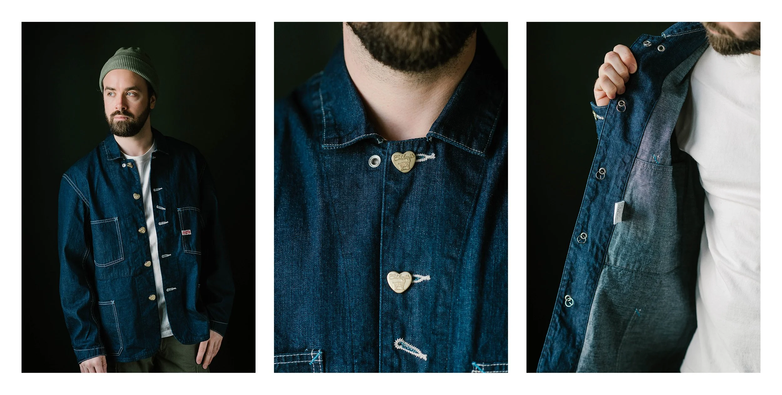 This time, TCB referred to a vintage Carhartt jacket from the 20s. It was a dream jacket for them, and they used details from their own jackets mixed with everything they know about the ones from an earlier time frame. This piece is developed from a super rare Master Cloth chore coat that had the heart-shaped tag only available until the 20s. They've used a relatively low tension weave for this piece with a 7 to 1 warp to weft count. This will lead to wild, raindrop fades! In terms of fading, this is dyed with 100% indigo dyes. According to TCB, at some point in history, they started diluting the indigo which gave garments a green tint as they faded. That will not be the case with this piece. This indigo has more blue than black tint to it for a light, royal color that is reminiscent of its origins (this is because they dyed the cotton fewer times in indigo baths to save cost).
