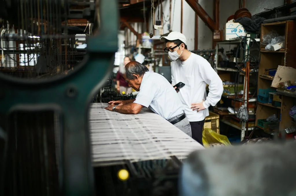 For the front body, the stripe pitch is wider and the color is lighter. On the other hand the back body stripe is narrower and the color is deeper. The yarn count of the warp is as follows: 20/ single thread and of the weft is 10/ triple thread.